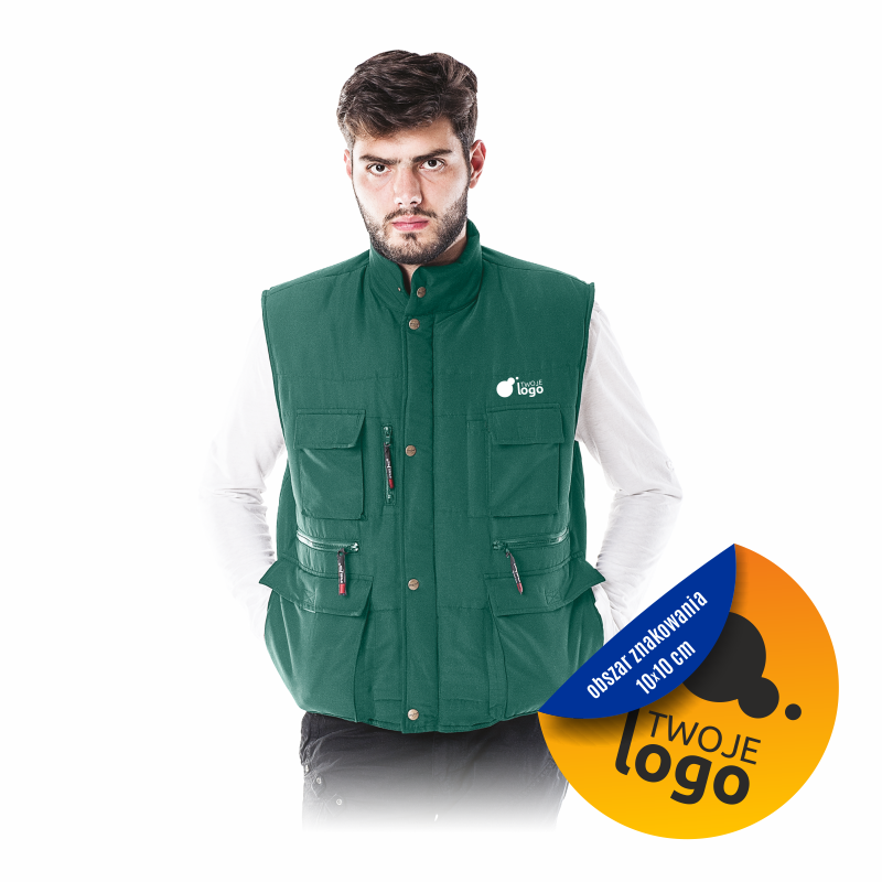 Funkcjonalny bezrękawnik ocieplany wykonany z poliestrowej powłoki, wyściółki ocieplającej oraz podszewki. Kamizelka robocza wyposażony jest w dużą ilość wielofunkcyjnych kieszeni, które ułatwiają przechowywanie wielu potrzebnych do pracy rzeczy. Bezrękawnik roboczy zapinany jest na zamek a dodatkowo posiada napy. Dodatkowym atutem kamizelki ocieplanej jest przedłużany tył. Zakończenia rękawów bezrękawnika zimowego wyposażone są od wewnątrz w specjalny materiał ze ściągaczem zabezpieczający przed dostaniem się wiatru. Bezrękawnik roboczy ocieplany idealnie nadaje się do oznakowania różnego rodzaju nadrukami reklamowymi, co stanowi świetną reklamę dla firmy.