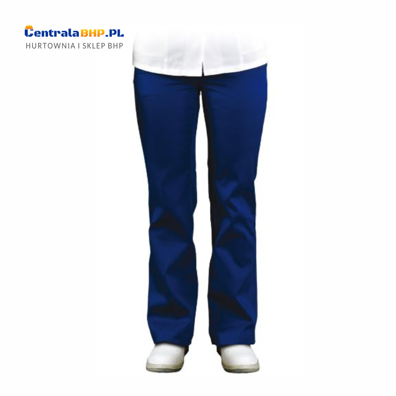Spodnie robocze damskie do pasa polecane Paniom pracującym w służbach medycznych, laboratoriach, aptekach, przemyśle spożywczym. Spodnie robocze dla kobiet wykonane są w ciemnoniebieskim kolorze oraz posiadają zapięcie na suwak. Spodnie ochronne damskie wyposażone są w dwie boczne kieszenie bardzo przydatne do przechowywania różnych przedmiotów w czasie pracy. Spodnie robocze dla kobiet idealnie nadają się do oznakowania nadrukami reklamowymi co stanowi świetną promocję firmy.